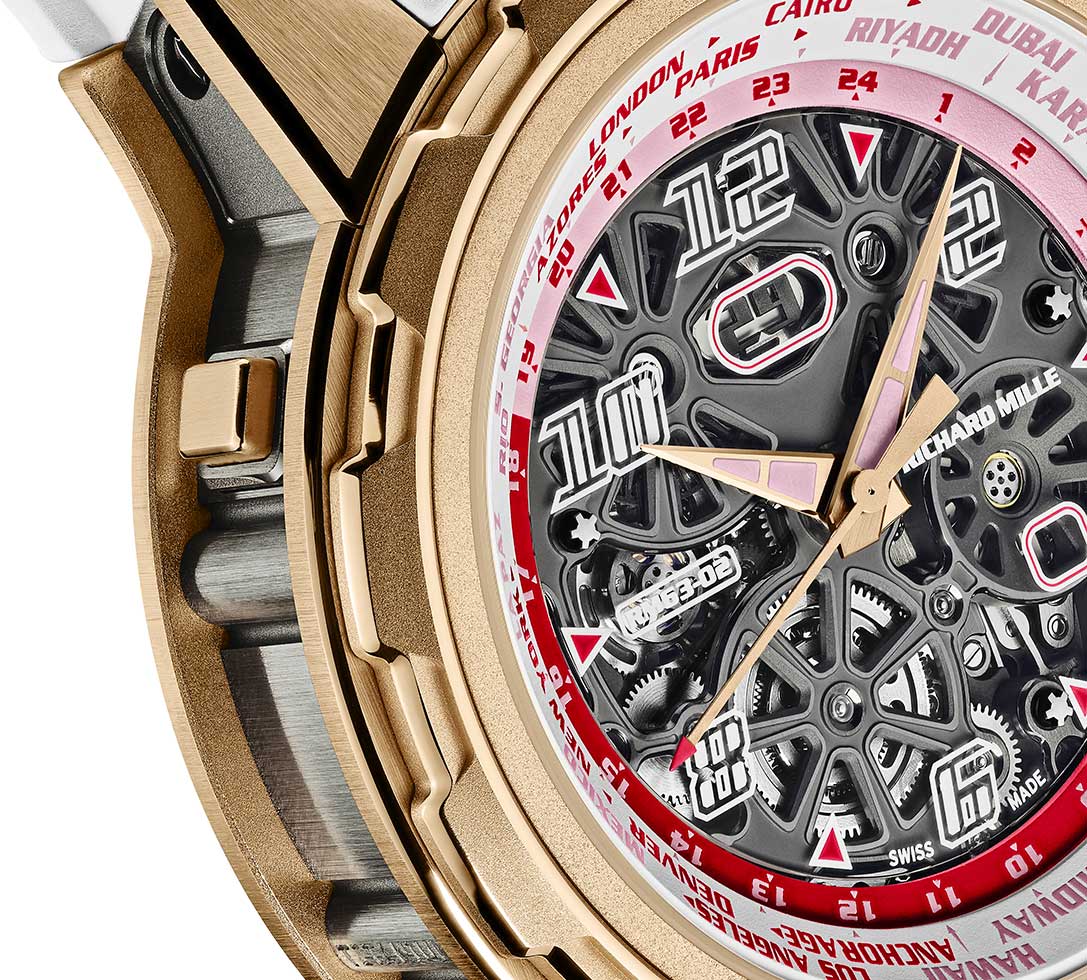 این ساعت نمادی از هماهنگی بینقص میان طراحی پیچیده و عملکرد فنی فوقالعاده است. قاب تیتانیومی سبک و مقاوم آن، صفحهای چندلایه با نمایش مناطق زمانی مختلف جهان را در خود جای داده که مخصوص علاقهمندان سفر و دقت طراحی شده است. سیستم Worldtimer این مدل با مکانیزمی هوشمند امکان تنظیم سریع ساعت محلی را تنها با چرخاندن تاج ساعت فراهم میکند — نوآوریای که ریچارد میل را از هر برند دیگری متمایز میسازد.