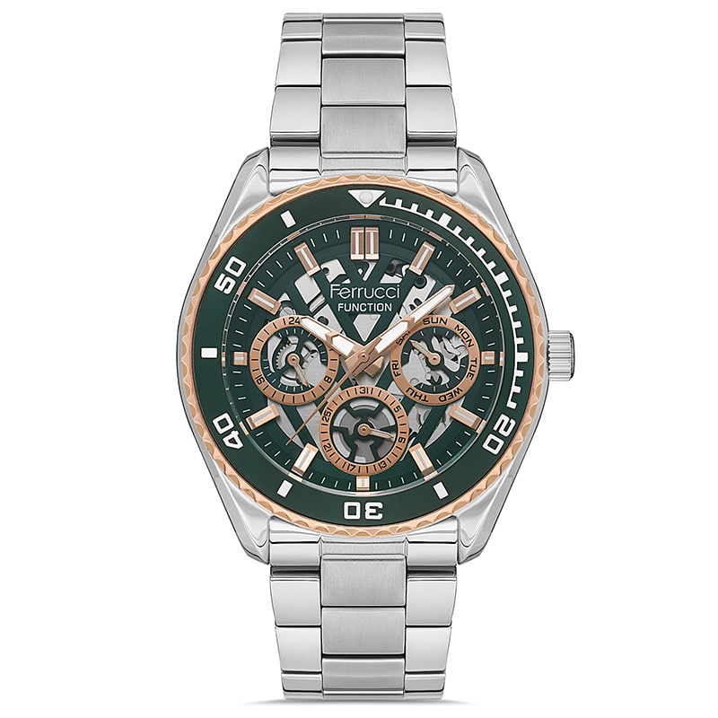 ترکیب رنگی بکار برده شده در این ساعت رنگ سبز ، رزگلد و سیلور است.