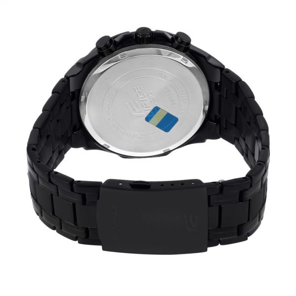 مقاومت در برابر آب تا عمق 100 متری کرونومتر 1/10 ثانیهای لوگوی EDIFICE بر روی دسته کوک (تاج)، درپوش پشتی، و گیره نقش بسته است صفحه و بدنه بزرگ برای طراحی قدرتمندی که واقعاً بر روی مچ دست خودنمایی میکند.